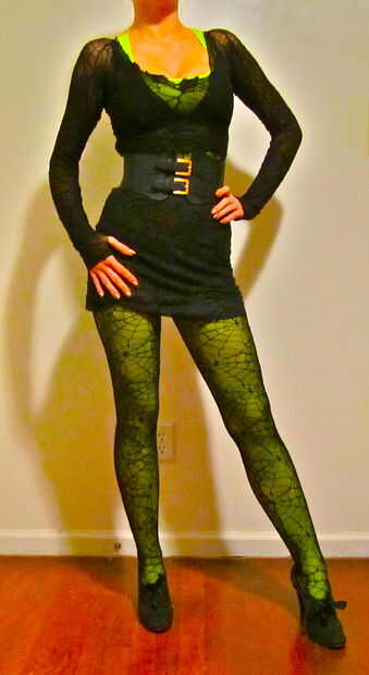 Para completar el disfraz, me puse medias de tela de araña, resbalón de encaje negro, medias de corte de mangas y verde neón medias /-tapa del tanque por debajo.