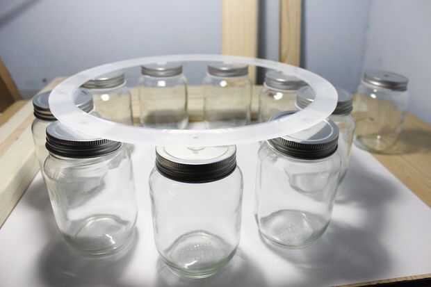 El tamaño del tarro de vidrio es 3 pulgadas de diámetro, por lo que he diseñado el marco de la lámpara con un diámetro de aproximadamente 14 1/2 pulgadas para sostener para las nueve de la jarra en su interior.
