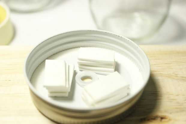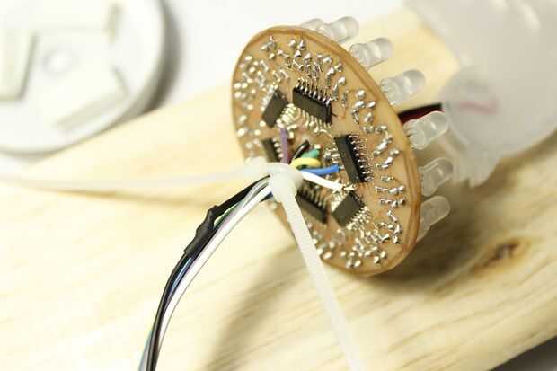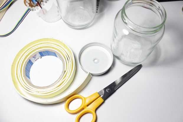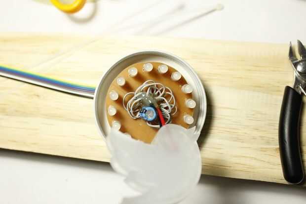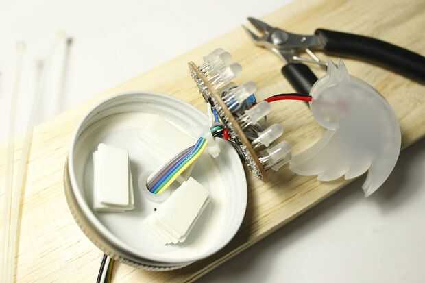 Yo uso cinta de espuma para apoyar el tablero LED debajo de la tapa, los lazos de plástico utilizados para sujetar la tapa y circuitos impresos juntos, evitar que los frascos cayendo.