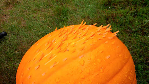Hackeado de arcos en el cefalotórax para anidar contra la cabeza y el abdomen y había estacionado a las tres partes uno contra el otro. Cortar ocho depresiones donde meter las piernas en.
