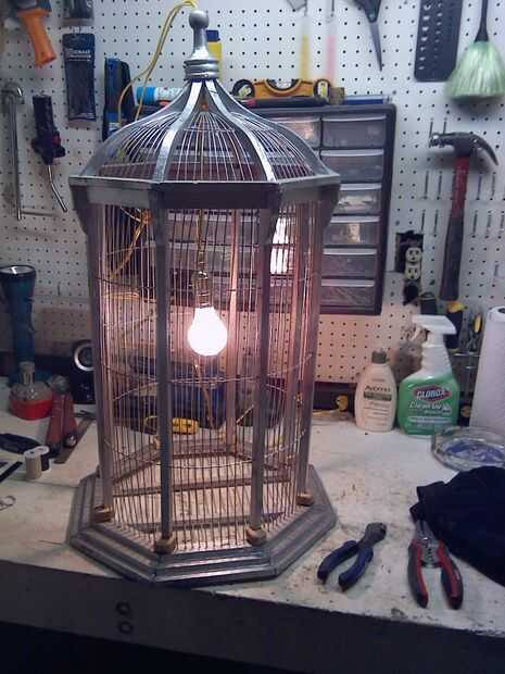 Para unir la luz quita la luz toma la cuerda del bastidor del alambre de la lámpara y perforar un gran agujero abajo por el centro de la parte superior de la jaula y harto el cable a través de él. Cuando tuve la luz en el lugar que quería para colgar dentro de la jaula, me pone un nudo en el cable para que no tire a través. Luego probé la luz y finalmente os adjunto una cadena a la parte superior de la jaula para que podrían colgar de la cadena. He probado la configuración entera colgada en mi taller.