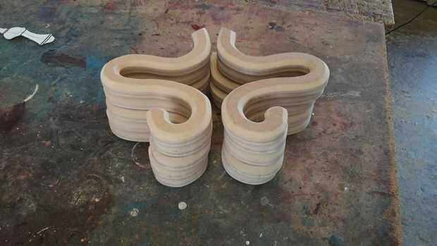 Con mi plantilla lo cortado hacia fuera 10 pedazos de hoja de mdf de 1,6 cm y luego tallado interior para el cableado. Luego pegar las 2 piezas juntas para hacer el total 5 ramas de la lámpara.
