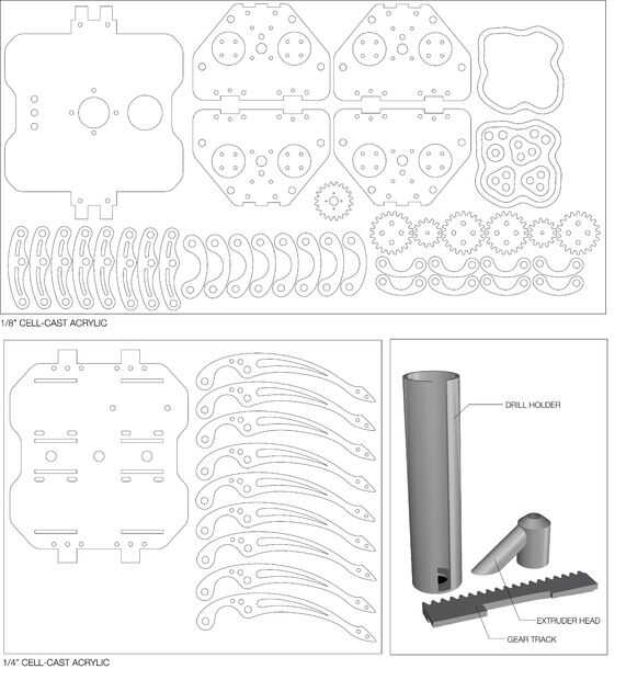 La mayor parte de la araña de Terra se hace a 1/8" acrílico, sin embargo, para añadir fuerza a las piernas y base, se utiliza acrílico de 1/4". Además, hay tres partes que necesitan ser 3d impreso (hemos utilizado una impresora tipo A con PLA). Estas piezas incluyen el soporte de taladro, cabeza de la extrusora y pista del engranaje.