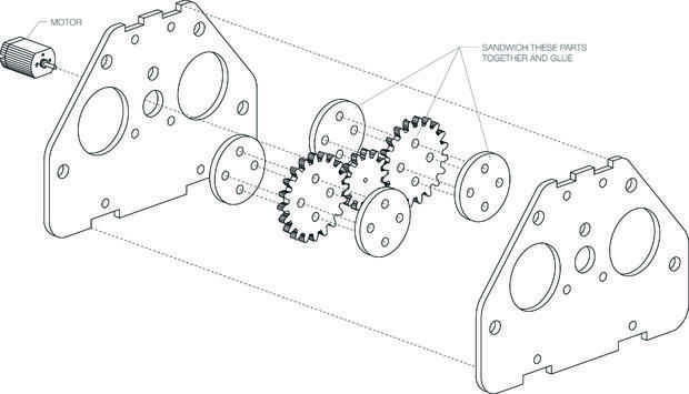 Cada caja se compone de tres engranajes; dos grandes y uno pequeño. Los dos grandes engranajes necesitan pegar (con pegamento de soldadura acrílico) a un círculo en cada lado como se muestra. Esto permitirá que el equipo sí mismo convertir libremente entre las dos piezas de acrílico exteriores. Consejo: Mediante abrazaderas de cremallera para fijar libremente los componentes mientras los ponen juntos.