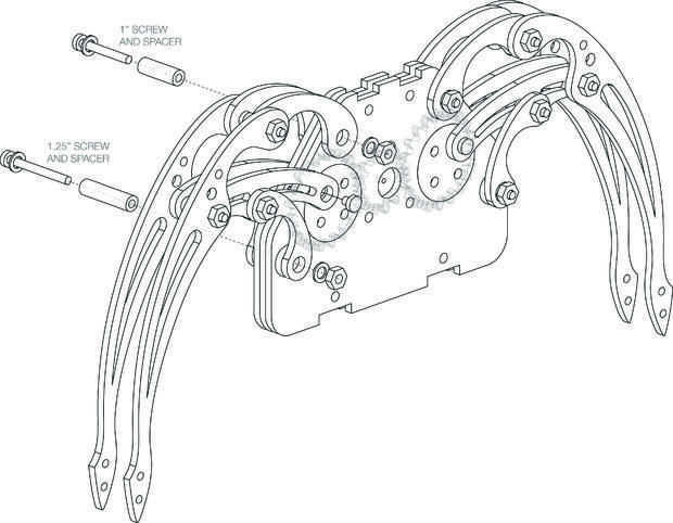 El bot final debe tener 8 patas total. Conecte a la caja de engranajes con los tornillos de 1" y 1.25" y espaciadores (tornillo más largo en la parte inferior). Siempre coloque una arandela entre cualquier dos piezas de plástico que se conecta.