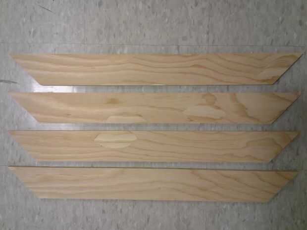 Usando una tabla vio, cortamos cuatro tiras ancho de 3 pulgadas a lo largo de la madera contrachapada. Después de eso, se utilizó una sierra radial del brazo a inglete los extremos de cada tira a 45°. Los primeros cortes de inglete se hicieron tan cerca de los extremos de las tiras como sea posible. El segundo cortes se realizaron de modo que la longitud final de cada capítulo 28", con el ángulo de corte perpendicular a la del primer corte.