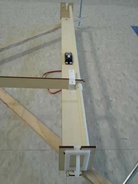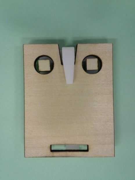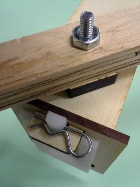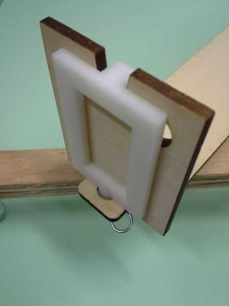 Nos sentimos decepcionados al saber que este diseño del casquillo final funcionaba muy bien. El agujero en la ficha era un poco demasiado grande para el pasador, que permitió las tapas a tambalearse hacia adelante y hacia atrás a lo largo de los ejes de los carriles. Como resultado, los extremos de los rieles a veces incapaz de permanecer en sus agujeros. Para resolver este problema, primero añadimos resortes de abrazaderas de plástico doblada a cada tapa hacia adentro. Aunque los resortes eran bastante fuertes, era todavía posible hacer inadvertidamente las tapas fuera de posición, permitiendo que los rieles a caer. Nos podríamos haber hecho a nuevo, más carriles, pero porque ya habíamos terminado el lijado éramos reacios a hacerlo. Por el contrario, intentamos insertar cuadrados delgados de madera dentro de los agujeros que los rieles, eficazmente acortando la distancia que debían cubrir, este enfoque fue algo eficaz, pero no es lo ideal ya que reduce la profundidad de los agujeros. Al final, hemos cortado con láser pequeño círculos de basswood de chatarra y pegado a los extremos de los rieles para extenderlos.