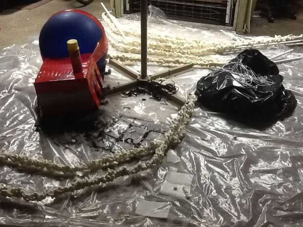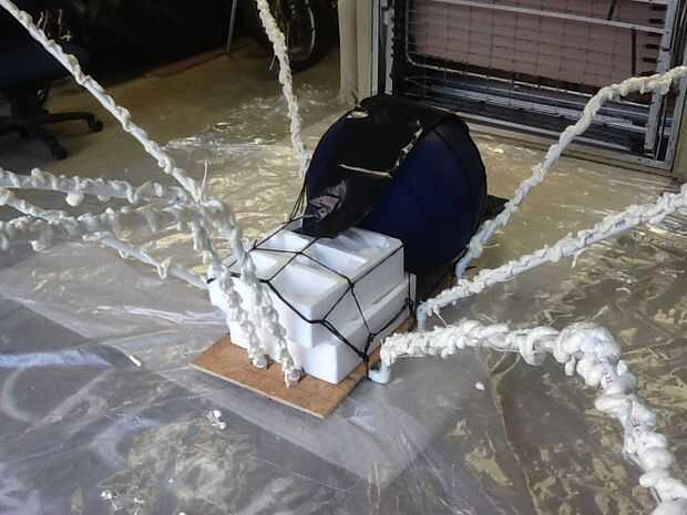 Utiliza un bloque de espuma de poliestireno de una cafetera que se pegan para formar un cuadrado. Detrás de él coloqué una pelota de yoga que fue grabada hacia abajo con la cinta de la alfombra roja. He cubierto todo con una bolsa de basura resistente y tiró al frente para hacer el área de la boca-como. He tallado 2 agujeros y condujo en globos solares para ojos. No brillan tan brillante como se esperaba por lo que considero una actualización aquí. Por supuesto eran sólo 1.99 cada uno! Cubrí todo con un bungee de web spider para mantenerlo todo junto, como guarnición.