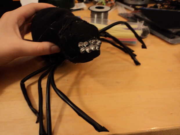 esto es Hellga, la araña gigante. ella se crea conmalla de alambre, sobre 2 rollos de 24" loalambre, para unir leperiódicocinta para ductosharina (papel maché)pintura en aerosol negrouna bolsa de material de la web de araña negraalgún tipo de pegame