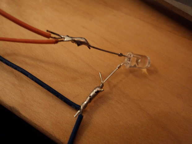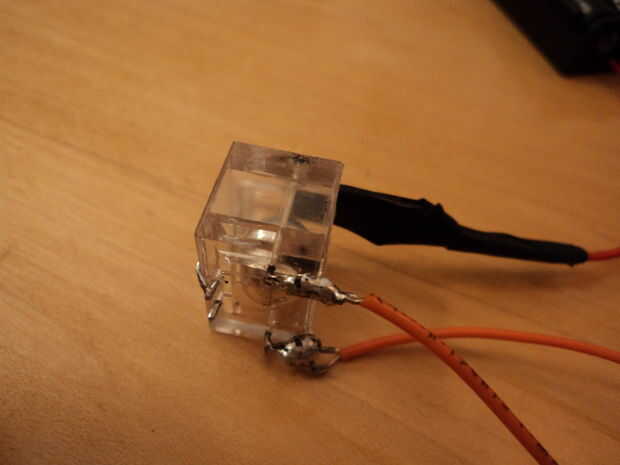 CUIDADO: Asegúrese de que uno de los extremos de cada LED tiene una conexión a tierra y la otra al poder. Puede hacer esto por el cableado del lado de tierra de todos los LEDs juntos y cableado directamente a la tierra su batería (pasando por alto los sensores de inclinación) y luego conectar el otro extremos a través de los sensores de inclinación. Nos podríamos haber roto un par de LEDs de soldadura, así que compruebe su circuito antes de conectar la alimentación.