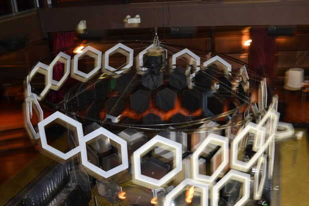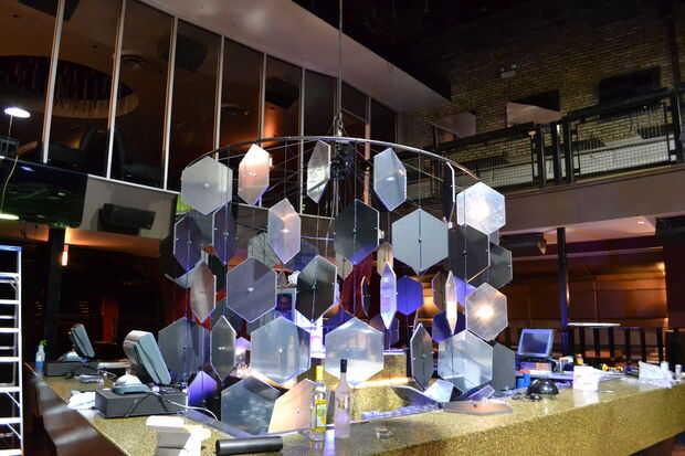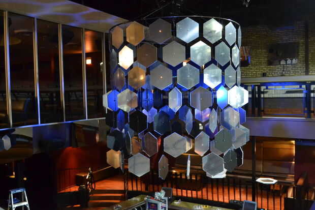 Step 4: Major assembly. Ahora que todas las piezas están listos es hora de poner juntos. 8 agujeros en cada uno de nuestros anillos de tubos perforados y Unidos iguales longitudes de cable a cada uno, que se reunieron en el centro y unida a un anillo de fijación. De esta manera que toda la estructura podría ser suspendida de un solo punto del centro, ideal para el polipasto de cadena que estábamos usando. Una vez que los anillos eran colgantes pudimos empezar a asociar formas. Los filamentos de hexágonos más pequeños unieron atando el cable de la lámpara alrededor de la tubería en el intervalo marcado y zip-atarla firmemente.  El resto del alambre de lámpara fue dirigido al centro de cableado más adelante. Línea de pesca se ejecute a través de los ojales en cada fila de hexágonos para sus exteriores. Los hexágonos externos fueron colgados uno por uno insertando alambre de colgar medido a través de los orificios preparados y doblar el extremo para sujetar.