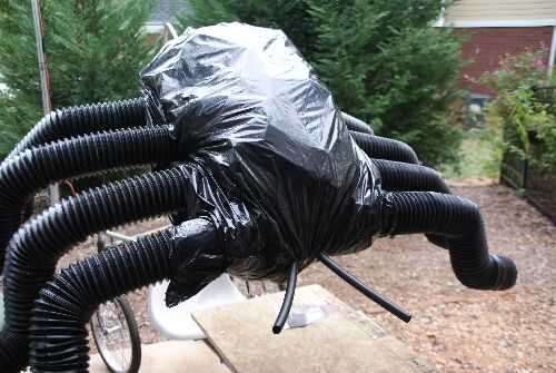 esto es Hellga, la araña gigante.  ella se crea conmalla de alambre, sobre 2 rollos de 24" loalambre, para unir leperiódicocinta para ductosharina (papel maché)pintura en aerosol negrouna bolsa de material de la web de araña negraalgún tipo de pegame