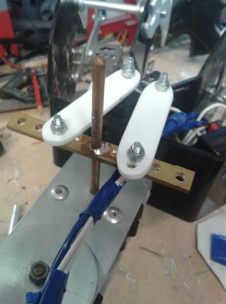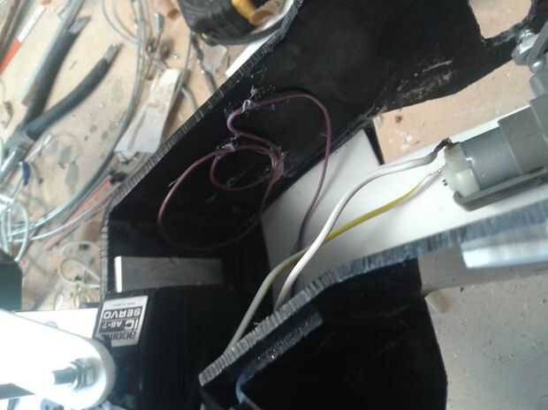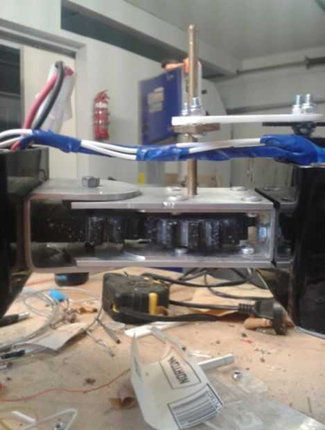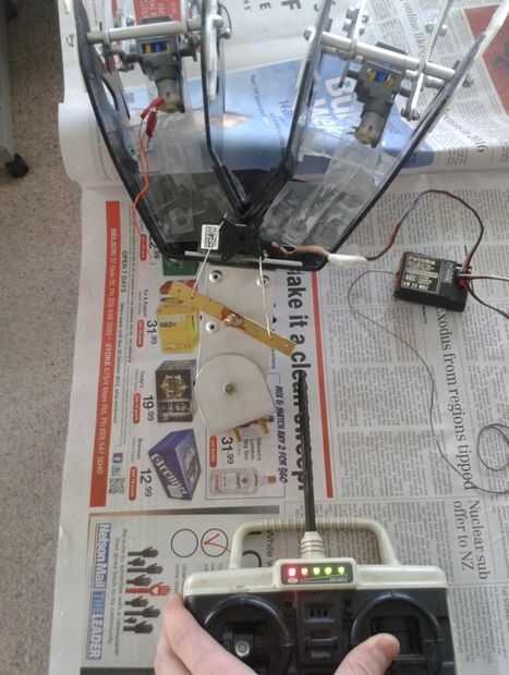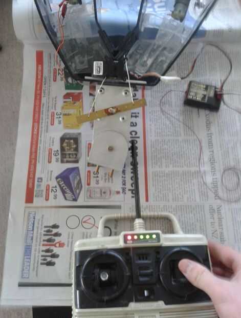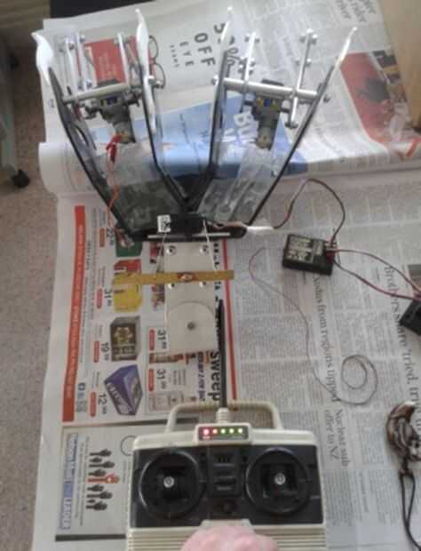 Después de que la electrónica se montaron empecé a probarlos para ver si todo funcionaba como se esperaba (en la foto) en la primera prueba que utilicé clips estirados hacia fuera en vez de los brazos de empuje para asegurar que el sistema funcionaba antes de correr el riesgo de más equipo.
