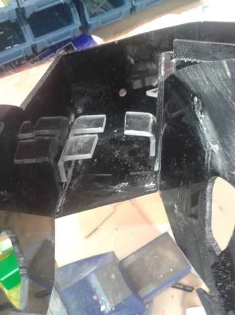 Montado el mecanismo de giro en la parte posterior de cada pieza de marco usando los agujeros en cada uno que perforé antes. Lo hice con tornillos de 5mm desde el módulo de giro que pasa a través de agujeros en el marco y luego aunque no se hace una cuadrado de aluminio de 3mm que fue utilizada como refuerzo para distribuir el peso uniformemente, si entonces se corre el riesgo de la cara posterior todo de la marco partiendo. Luego se unieron estos pernos con tuercas de seguridad y el mecanismo de giro se hizo seguro.
