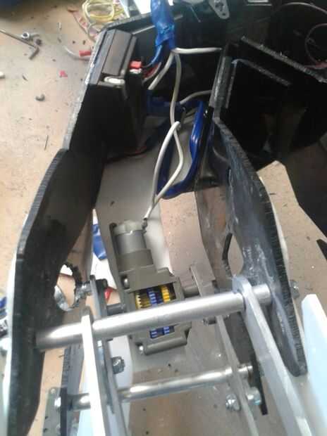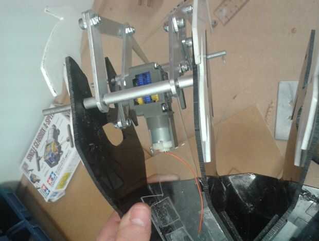 Ahora que los conjuntos de pierna y cajas de cambio podrían encajar dentro del marco estaba lista para iniciar el proceso de montaje. En primer lugar os adjunto los pares de la pierna a mi marco usando las barras a través de las pintas de pivote, espaciadores y tuercas de seguridad. Después de esto se hizo las piernas fueron completamente montado y exactamente fuera de fase con excepción de la caja de engranajes colgando la parte de atrás. A fin de seguro esta abajo I había probado dos métodos diferentes. El primer error para mi pero tampoco funcionaría si se hace correctamente. Ambos métodos involucrados utilizando plástico de acrílico para hacer un montaje de la caja de cambios (en la foto). Estaba hecha de plástico acrílico grueso de 3 mm cortar con una herramienta eléctrica y fijados en el interior espacio de la estructura con la mitad de lo que domina en la caja de cambios. El lado delgado es donde se sentaba el motor.