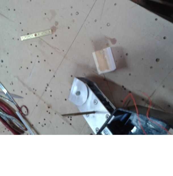 Antes que el servo a mi mecanismo de giro que tenía que hacer un método de montaje apropiado para ella. En primer lugar quiero hackear aserrado hacia fuera de un pequeño rectángulo de una hoja de latón y nueve orificios en ella, cuatro pares de los cuales emanaban hacia fuera del agujero central a distancias especificadas. A continuación aseguró el rectángulo de latón en la barra de cobre amarillo conectado a la corona grande y después de asegurarse de que era paralelo a la parte posterior del servo soldar con un soplete. Una vez que esto fue unida pude luego hacer empuje brazos entre el servo y mi brazo de reacción a mano.
