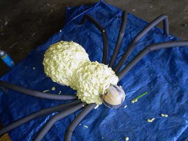 Ahora este es el elemento relativamente uncheap de la ecuación de la araña. Aislante de espuma en spray. Sabes el tipo que conseguir en cualquier ferretería.  Unos seis bucks una lata y lo hacen en diferentes grados de expansión y la rigidez. Había aquí una cura de aprendizaje. Para el cuerpo demandó un medio de expansión de espuma semi-flexible spray para el cuerpo. Que era una lata entera... realmente no te mucho kilometraje fuera una lata.