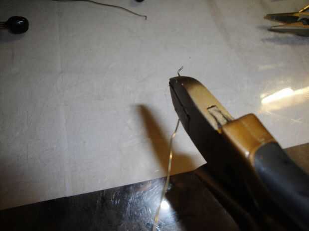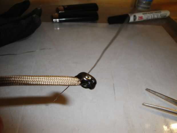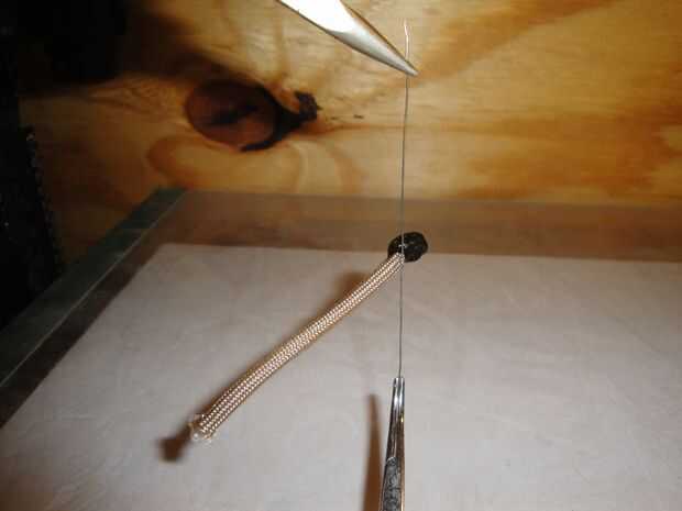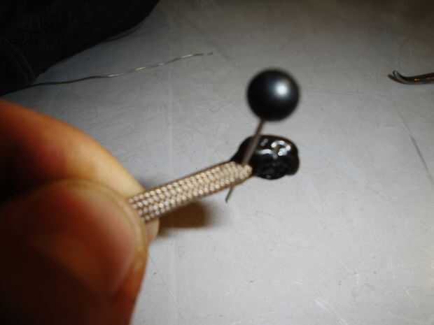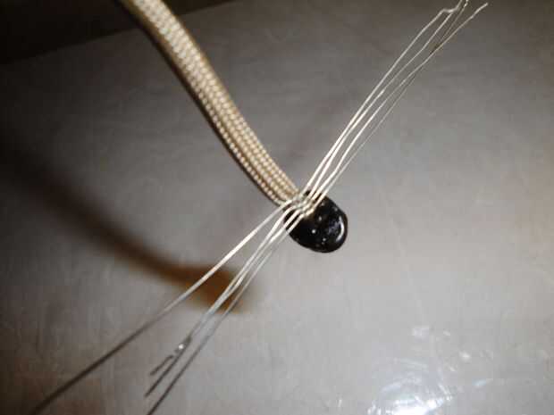 Cuidadosamente doble el cable y atar en un nudo alrededor de la parte inferior del cuerpo de la araña futuro. Tire el nudo apretado usando dos pinzas o fórceps.