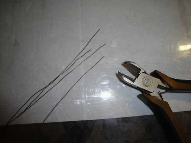 Naturalmente, la parte del abdomen que acumuló en el último paso debe quedar hacia arriba. Visualmente la altura (como se ve desde el lado) de la médula 550 se dividen en tercios y empujar hacia los lados por la parte inferior tercera del cordón con un alfiler, entrando y saliendo de tan cerca del abdomen como sea posible. Quitar el pasador y deslízalo suavemente una de sus piernas de alambre a través del orificio pequeño que ha creado. Deje de una vez que el alambre se centra en el cable.