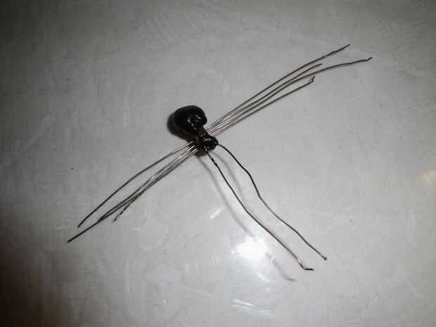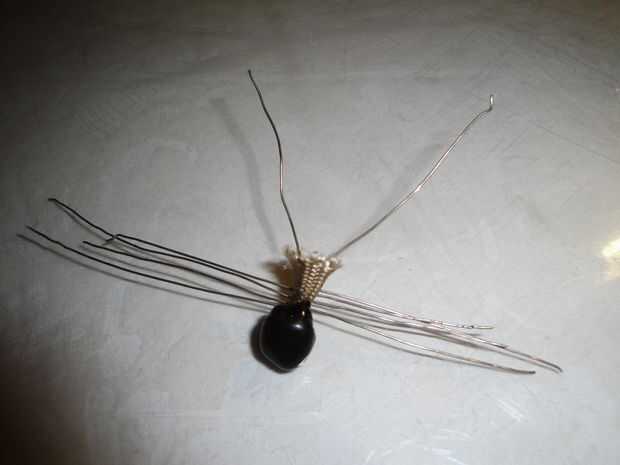Mandíbulas. Una quinta sección del alambre y doblar en forma de "v" estrecha. Coloque una pequeña gota de pegamento en el punto de la «v» y luego inserte el cable en el cuerpo de la araña lo más lejos posible, tratando de tocar el abdomen. Mantener la presión hacia atrás en el alambre durante unos segundos hasta que el pegamento se ponga.