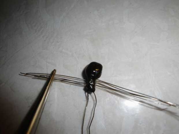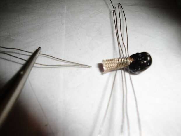 Encender de nuevo su segmento de "pincel" de cable de 550 y unto un poco de cable fundido sobre la parte posterior de la araña y unirse a la cabeza. Esto cubre el restante cable 550 expuesto y forma cefalotórax de la araña.