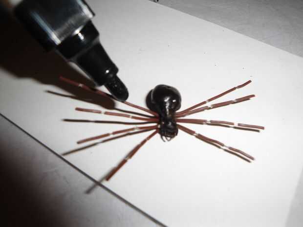 Puede pintar el cuerpo de la araña con estilógrafos pigmentados si usted necesita una araña con coloración con dibujos. Te recomiendo plumas Pigma Micron®, disponibles de cualquier proveedor de arte o hobby.