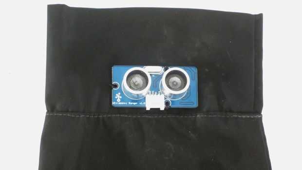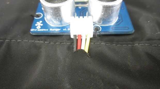 El sensor ultrasónico puede acoplarse al lado de una manga. Esto le permite moverse fácilmente y punto en cualquier dirección que desee. La Junta del sensor tuvo tres grandes agujeros en ella. Estos eran lugares convenientes para coser la Junta a la capa. A lazo de hilo por cada orificio y a través de la manga para asegurarlo en su lugar.