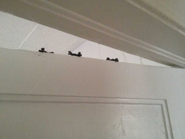 Ahora toma las arañas y el final de la etiqueta de la línea de pesca para arriba en la parte superior del parante de la puerta que la víctima ;) a través de la cinta. (como se ve en la foto #23 y 24)