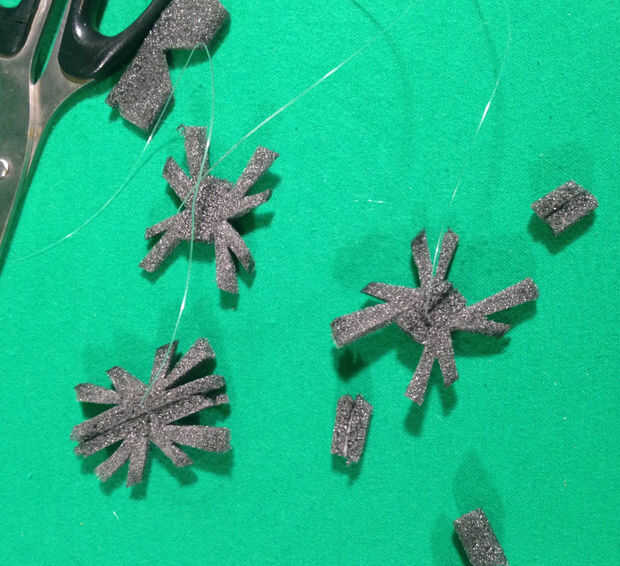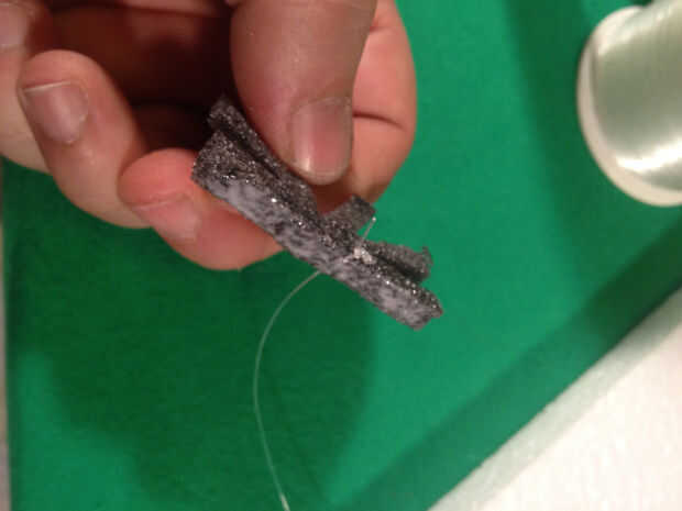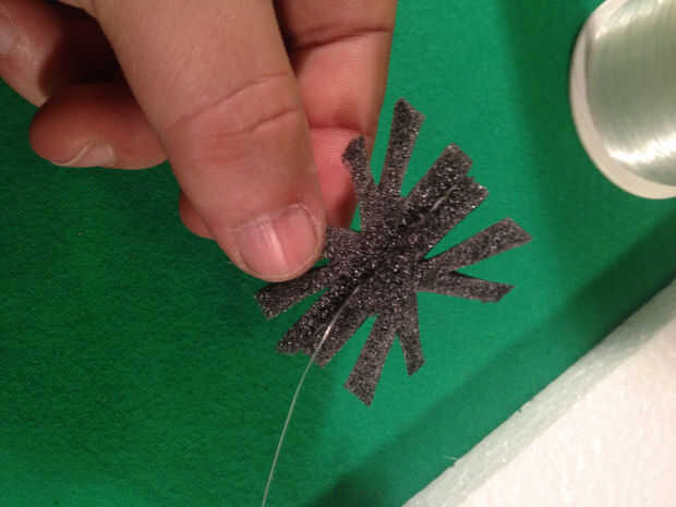 Tomar una parte de ea araña y poner pegamento en él y colocar la pieza de la línea de pesca en el medio con el nudo a un lado (como se ve en la foto #10)