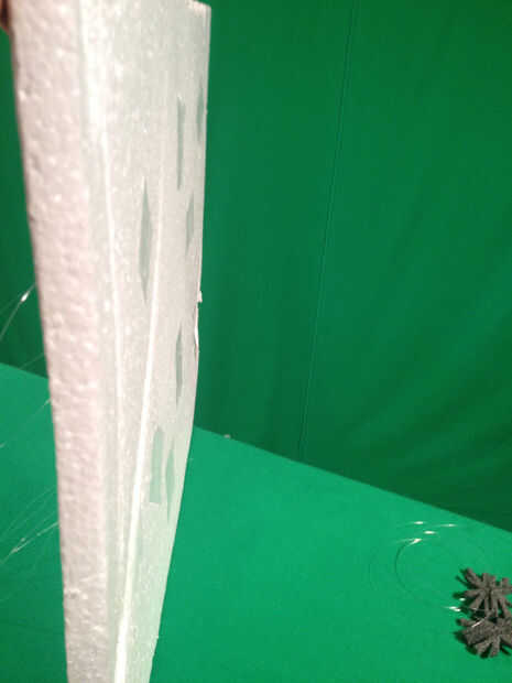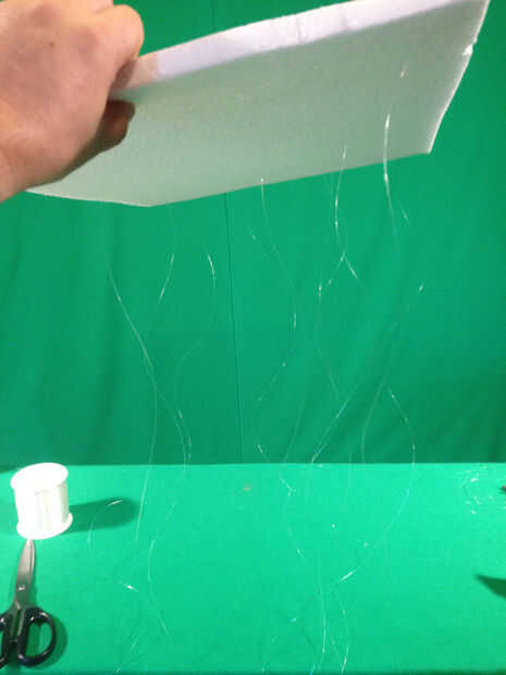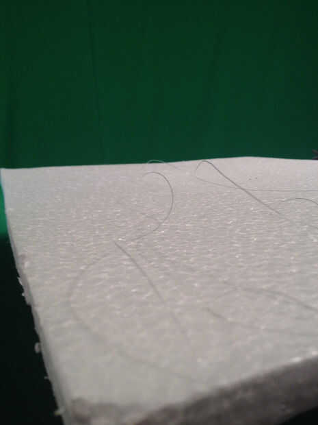 Ahora que tienes el sedal todo listo para ir. Toma cada uno y meter al azar uno de los extremos a través de todo el tablero de la espuma. (como se ve en la foto #16)