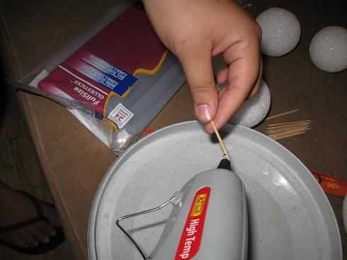Añadir un poco de hotglue al otro extremo de los palillos de dientes.
