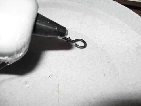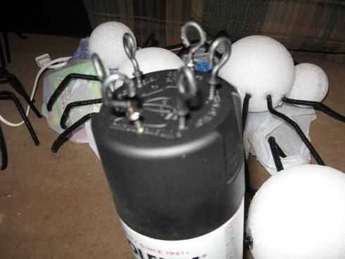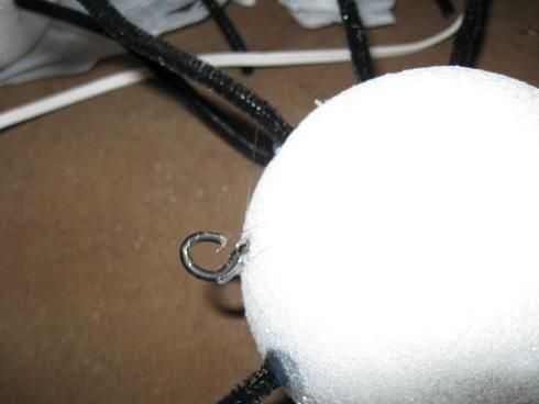 tengo unos ganchos de la taza de un proyecto anterior y ellos pellizcando cerrado, hacen perfecta araña perchas. mina son bronceados, así pintaba negro. Añadir gota de pegamento caliente a los hilos de rosca del gancho seco, negro. Simplemente atornille el gancho negro pegajoso el heiney arañas.