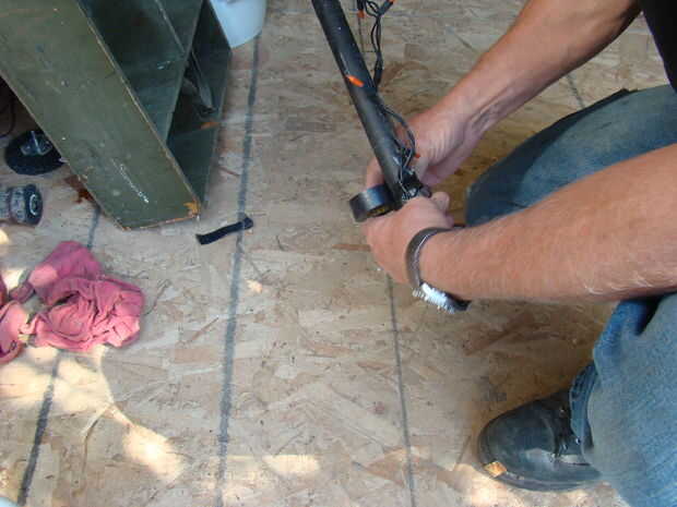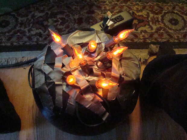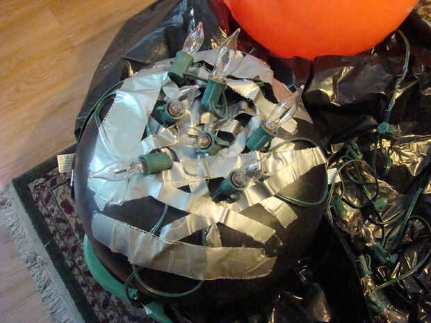 Luego poner el cuerpo en la parte superior de la base y utilice cinta adhesiva para unir a las piernas. La cabeza es pegado al cuerpo del conducto y su cable de extensión está enchufado a la misma regleta como las piernas. Utilizar bolsas de plástico y cinta adhesiva negra para proteger la franja eléctrico y enchufes del tiempo.