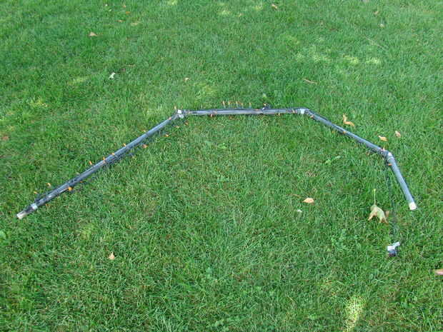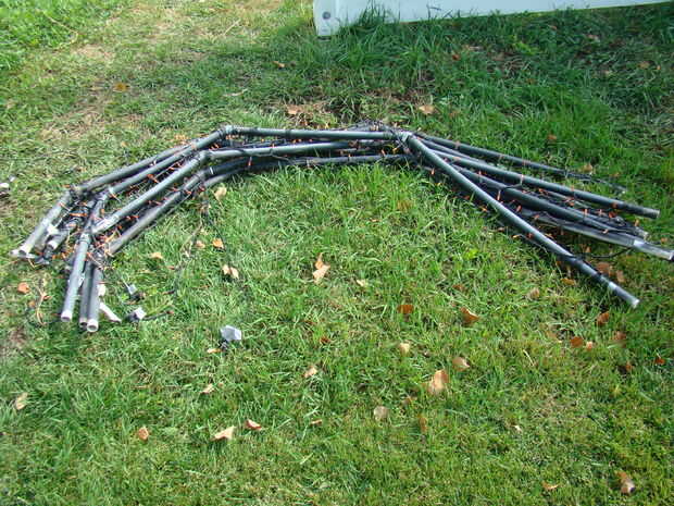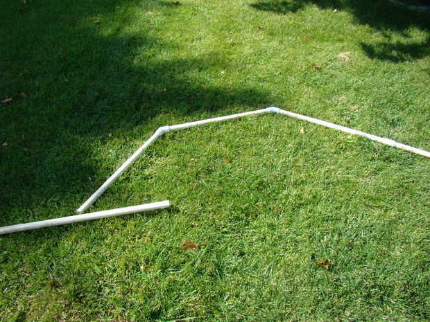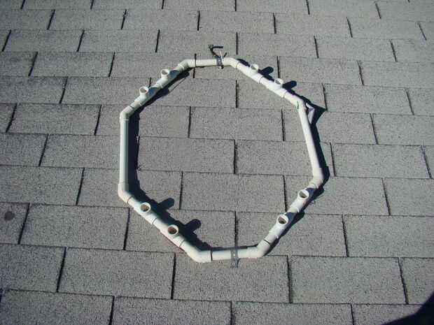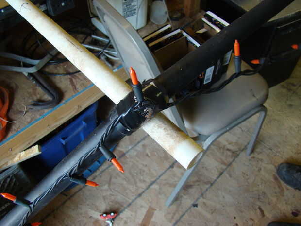 Primero la base, unir las diferentes piezas como se ve en la foto, asegurándose de que la conexión T tiene el agujero 3 se pegue hacia arriba listo para el final de la pata de araña pegada en él. Determinar donde se desea la araña que se encuentra y atornillar la base en el techo. Salimos de la base allí 24/7/365. Nunca nos hemos pintado la base porque es blanca en un techo blanco, por lo que no fue destacado durante el resto del año.