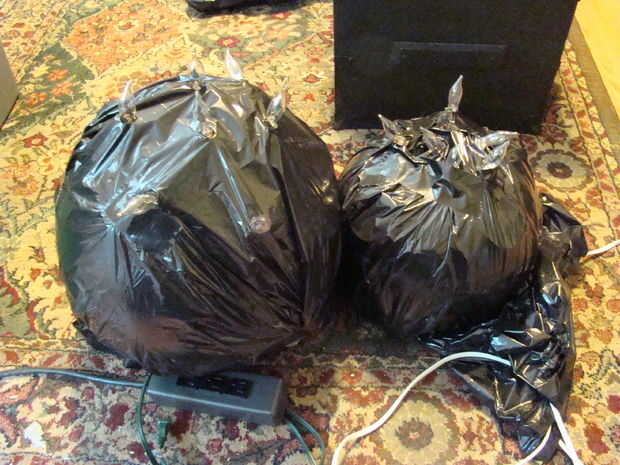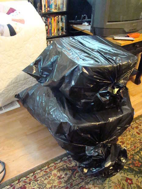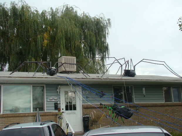 Cuando empezamos nos pusieron todo tipo de cosas en las bolsas de plástico negro para el cuerpo de la araña. Tuvimos un cuerpo lleno de mosca de periódicos desde el tejado de un año. Ahora sólo utilizamos la misma caja de almacenaje grande, año tras año. Realmente no importa lo que es la forma del cuerpo, siempre y cuando tiene uno, y esto funciona muy bien. Así que poner una bolsa de basura nueva, grande, negro sobre el lazo de la caja y cremallera cerró.