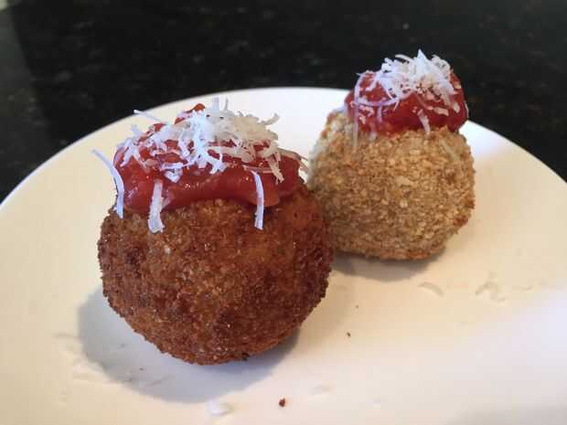 Todo lo que tienes que hacer es tomar algún risotto frío, coloque un poco de queso mozzarella en el centro, dragado en harina, huevo y pan rallado y cocinarlas! Lo bueno de esta receta es que usted puede ser saludable en la creación de estas hermosas bolas por la hornada les profunda los freír. Estos son grandes por sí mismos pero van muy bien con alguna salsa napolitana casera o salsa de tomate.