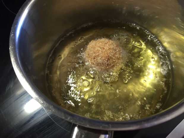 En salsa profunda cacerola caliente el aceite a fuego medio alto hasta que puede colocar algún pan o arroz en el aceite y fry o vigorosamente burbujas.