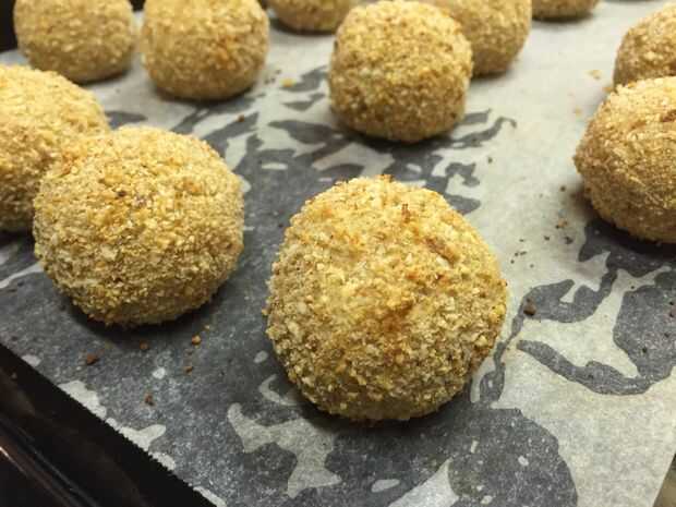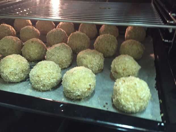 me encanta bolas tradicional risotto italiano con queso. En Italia risotto frío es tradicionalmente en forma de bolitas, enrollado en pan rallado y fritas en tuberías calientes y crujientes "geográficas". Pueden ser bolas grandes con queso en el