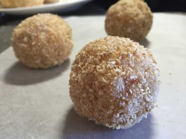 estas bolas de pollo frito son ideales para aperitivos de noche o entrantes. El revestimiento exterior es crujiente y crocante y las bolas se derriten en la boca. Las bolas de pollo y dip pueden preparados y servidos caliente inmediatamente o sirvió