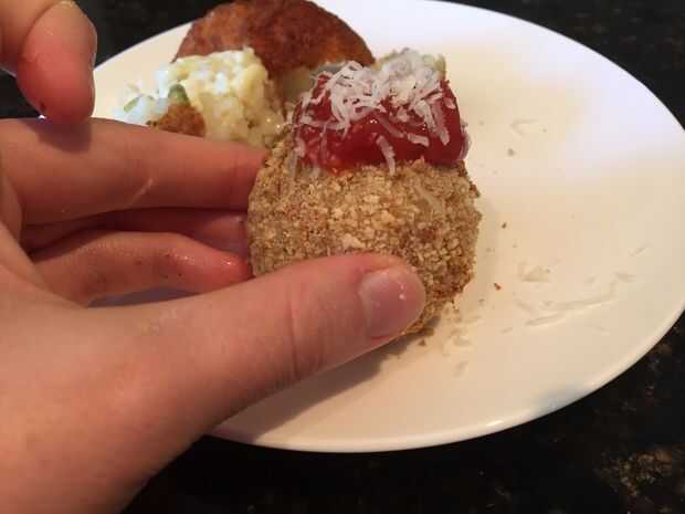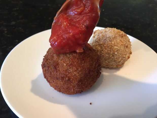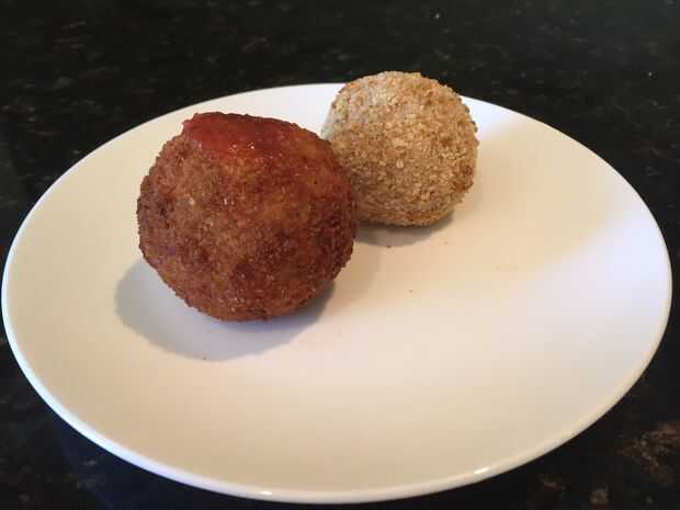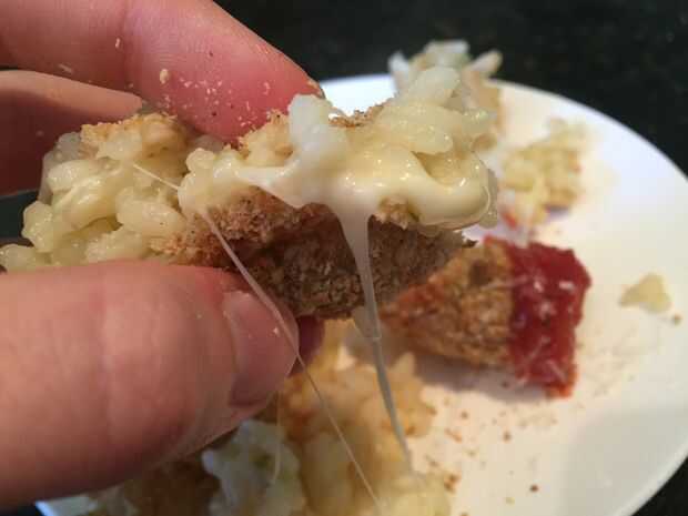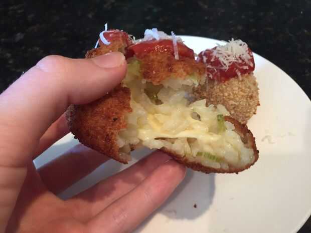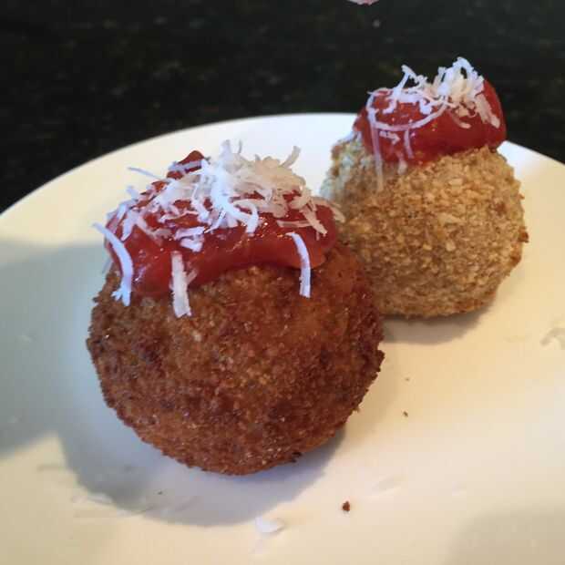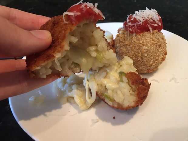 me encanta bolas tradicional risotto italiano con queso. En Italia risotto frío es tradicionalmente en forma de bolitas, enrollado en pan rallado y fritas en tuberías calientes y crujientes "geográficas". Pueden ser bolas grandes con queso en el