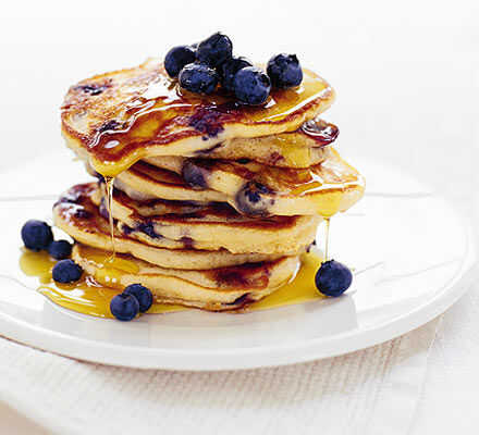 Calentar una cucharadita de aceite o botón de mantequilla en una sartén antiadherente grande. Caer una cucharada grande de masa por tortilla en la sartén para hacer tortitas de unos 7,5 cm a través. Hacer tres o cuatro tortitas a la vez. Cocine durante 3 minutos a fuego medio hasta que pequeñas burbujas aparecen en la superficie de cada crepe, gire a la y cocinan otros 2-3 minutos hasta que estén doradas. Cubrir con papel de cocina para mantener el calor mientras usas el resto de la masa. Servir con jarabe de oro y el resto de los arándanos.