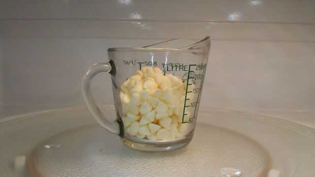 Derretir trocitos de chocolate 1/2 bolsa blanca en el microondas durante 15 segundos. Revolver.