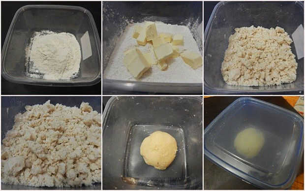 2. agregar los cubos de mantequilla fría, mezclar con el tenedor o la mano, hasta que se asemeja a la arena húmeda.