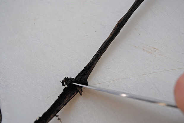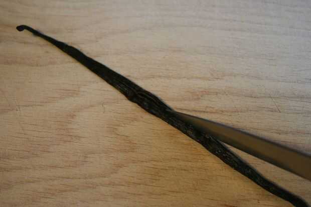 La mejor manera de llegar a este caviar es coger un cuchillo de pelado agudo y cuidadosamente dividir vainilla longitudinalmente. Luego, con su pequeño cuchillo o una cuchara pequeña, raspar completamente ambos lados de la haba.