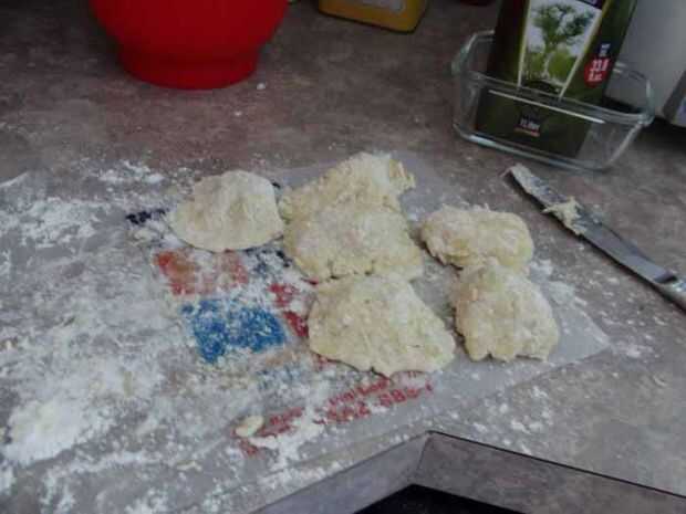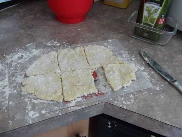 Volcar la masa sobre una superficie rodante (uso una hoja de corte porque es fácil de limpiar.) y ruede hacia fuera. Si está pegajosa, Espolvoree harina sobre la superficie y trabajar en la masa.