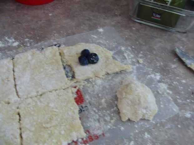 Cortar la masa en segmentos y hacer un pequeño montón de arándanos en cada segmento. Doblar la masa y sellar el paquete.