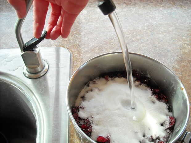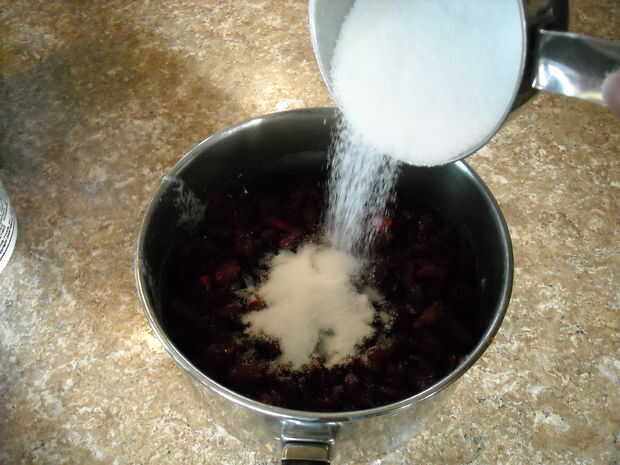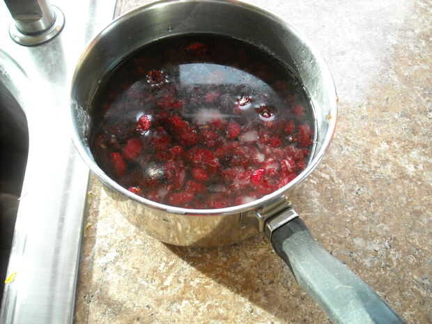 Añadir el azúcar blanco y arándanos en una cacerola. Cubrirlas con una o dos pulgadas de agua. Llevar el agua a ebullición y hervir durante cinco minutos. Los arándanos deben plump up y obtener jugosas.