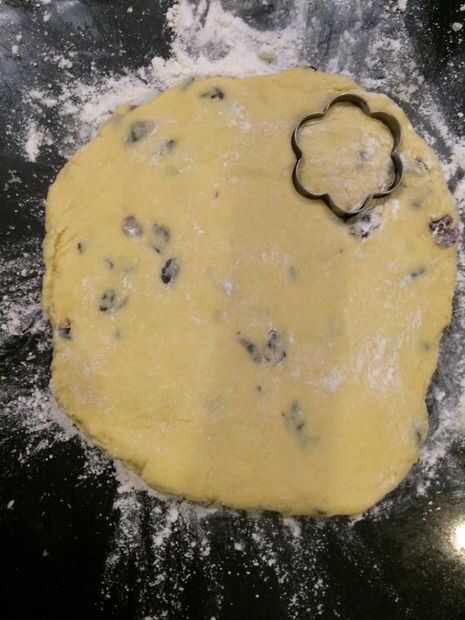 Estirar la masa alrededor de 1 pulgada (2,5 cm) piezas de espesor y cortadas con un cortador de galletas medianas. Volver a rodar trozos de masa para hacer bollos más!
