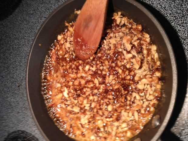1. Coloque 3 cucharadas aclaro mantequilla y 1/4 taza Jarabe de arce en una sartén a fuego alto y mezcla hasta disolver.  Baje un poco de calor y añadir las nueces picadas.  Revuelva sobre fuego medio alto durante 2-3 minutos hasta bien cubierto.  SEA cuidadoso: jarabe de arce caliente y causar quemaduras inmediatas!!