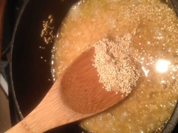 Caliente el aceite en una cacerola mediana sobre fuego medio alto. Añadir la cebolla y cocinar hasta que estén transparentes, aproximadamente 5 minutos. Agregue el ajo y cocinar hasta que estén dorados, aproximadamente 2 minutos. Agregar los restantes 2 tazas caldo orgánico, sal y pimienta y haga hervir. Inmediatamente agregue la quinoa, cubra con papel de aluminio o la tapa y retire del fuego. Dejar la quinua reposar 5 minutos. Retire la cubierta y un tenedor para separar y esponjar la quinua.